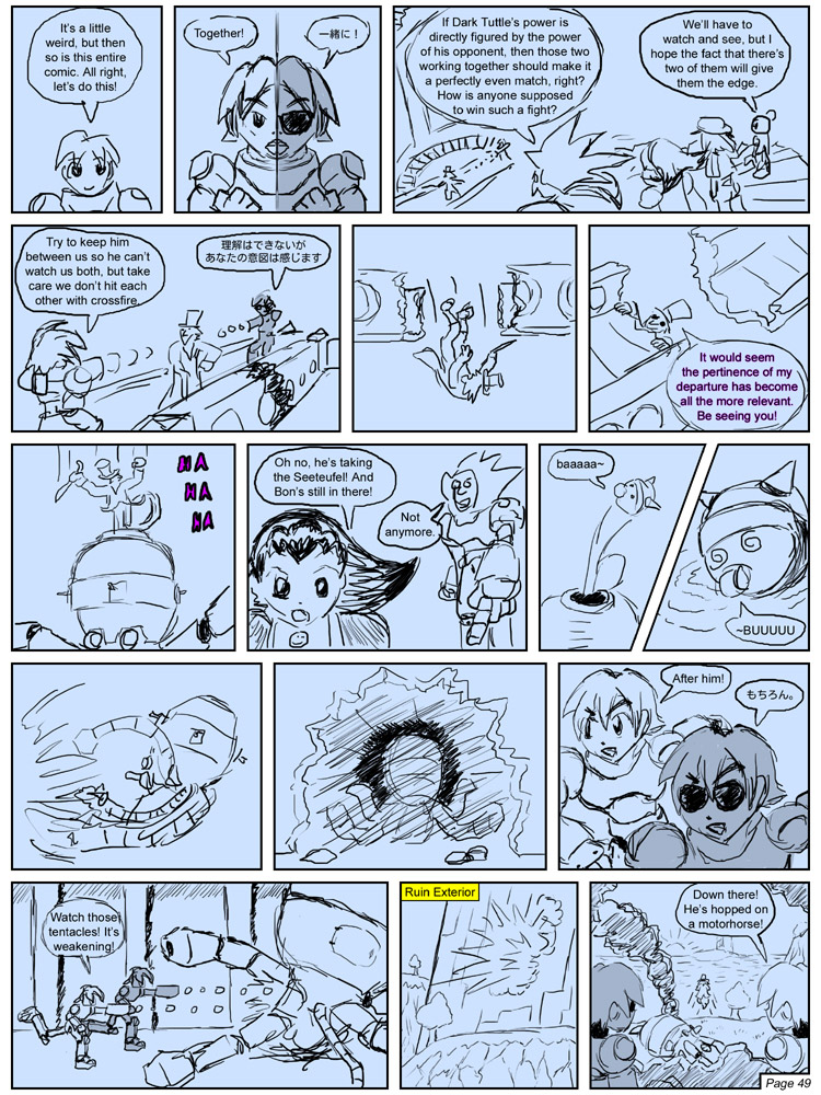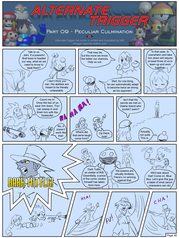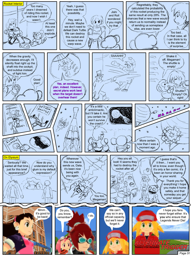 The earliest days of Alternate Trigger were highly whimsical, but when the comic got a little more serious in nature (higher production values, more focus on progressing an actual story instead of merely stringing together community-based gags and references, etc.), then it became natural to plan ahead. At some point I began using rough sketches to anticipate which scenes I would need to render, and how many panels it would take to play out conversations, and so on.