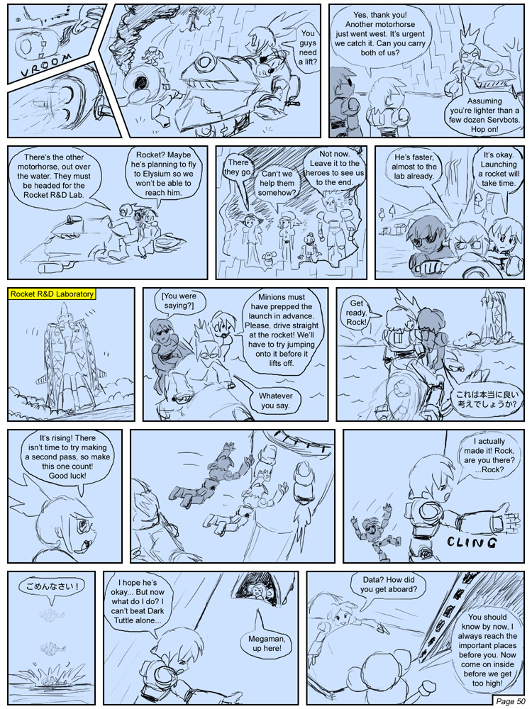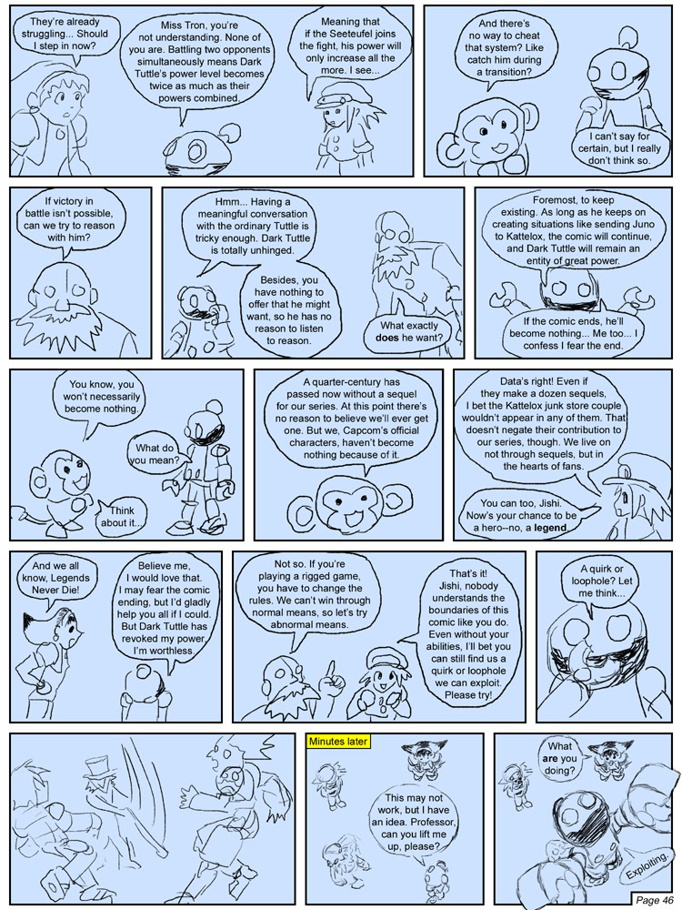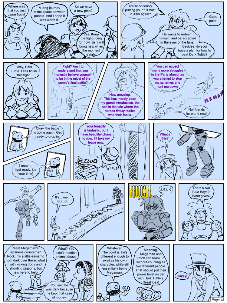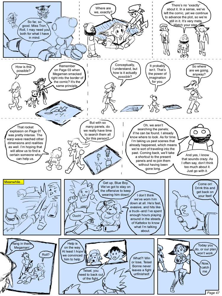 At first the sketches were extremely rough, no more than scribbles and conceptual notes on what was to be said—as opposed to actual dialogue. Like the comic itself, these sketches became more refined in time, as I found them more and more helpful in the planning phase. Instead of just showing Megaman, I could sketch him in the pose I envisioned, so I'd know what to aim for when doing the 3D render. The better the sketches and the more fleshed out the text, the more accurately I could assess the flow, pacing, and visual presence of a given page, which is important in cases where I want to reach a certain point, like say a big reveal, by the end of a page so that the reader can be surprised when they turn to the next. The sketches also give me a bit of reflection time, so to speak. Sometimes, by the time I get around to 3D renders, I've gotten new and/or better ideas on how to work things differently from how it was planned in-sketch.